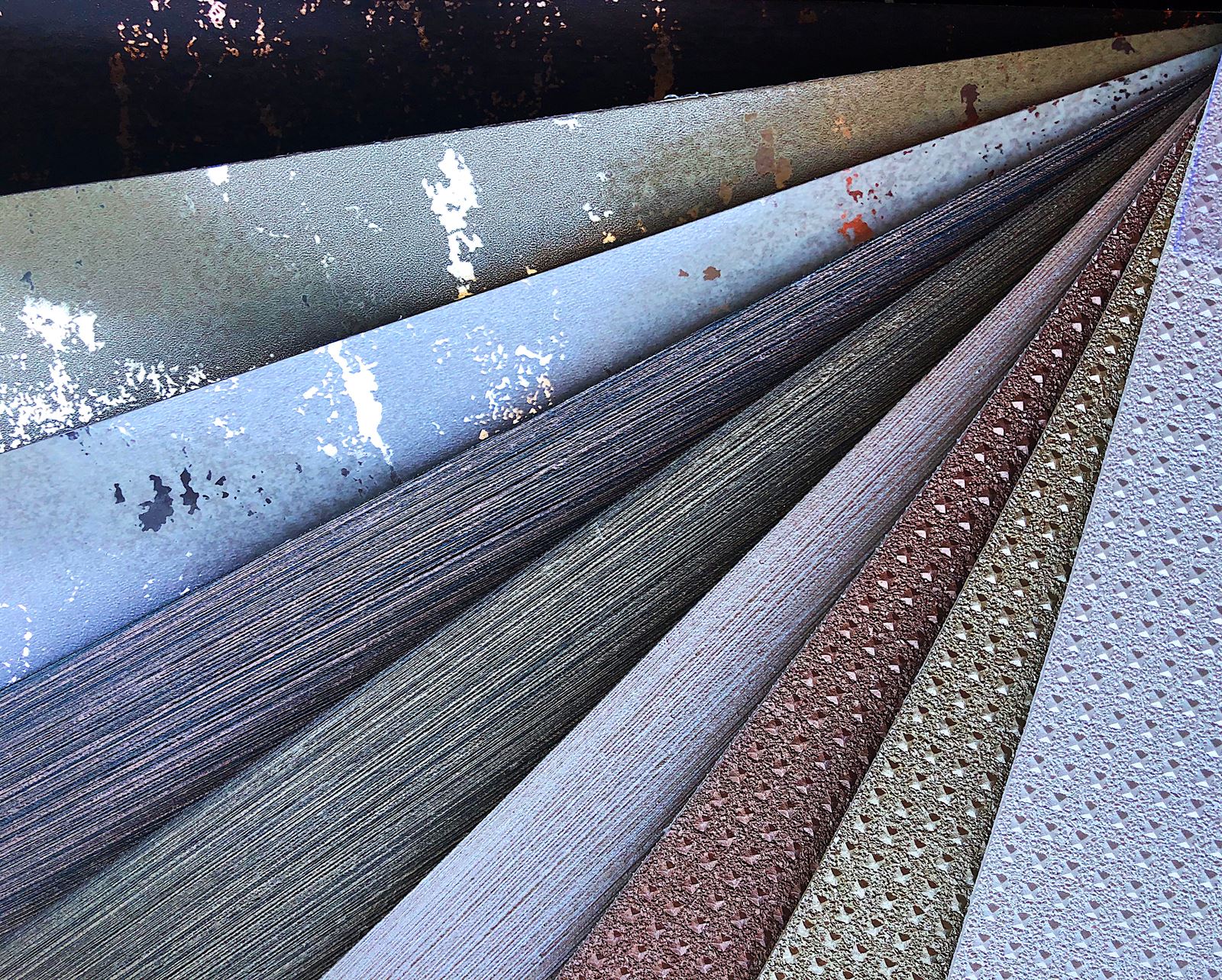 This summer we’ve launched three new wide width fabric-backed vinyl wallcoverings for the commercial interiors market. The new designs showcase a spectrum of metallic effects – dramatic distressed tiles, a vertical woven emboss and an industrial studded texture.