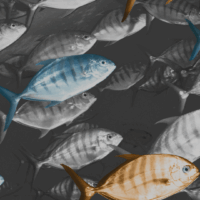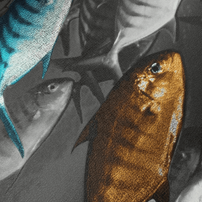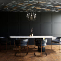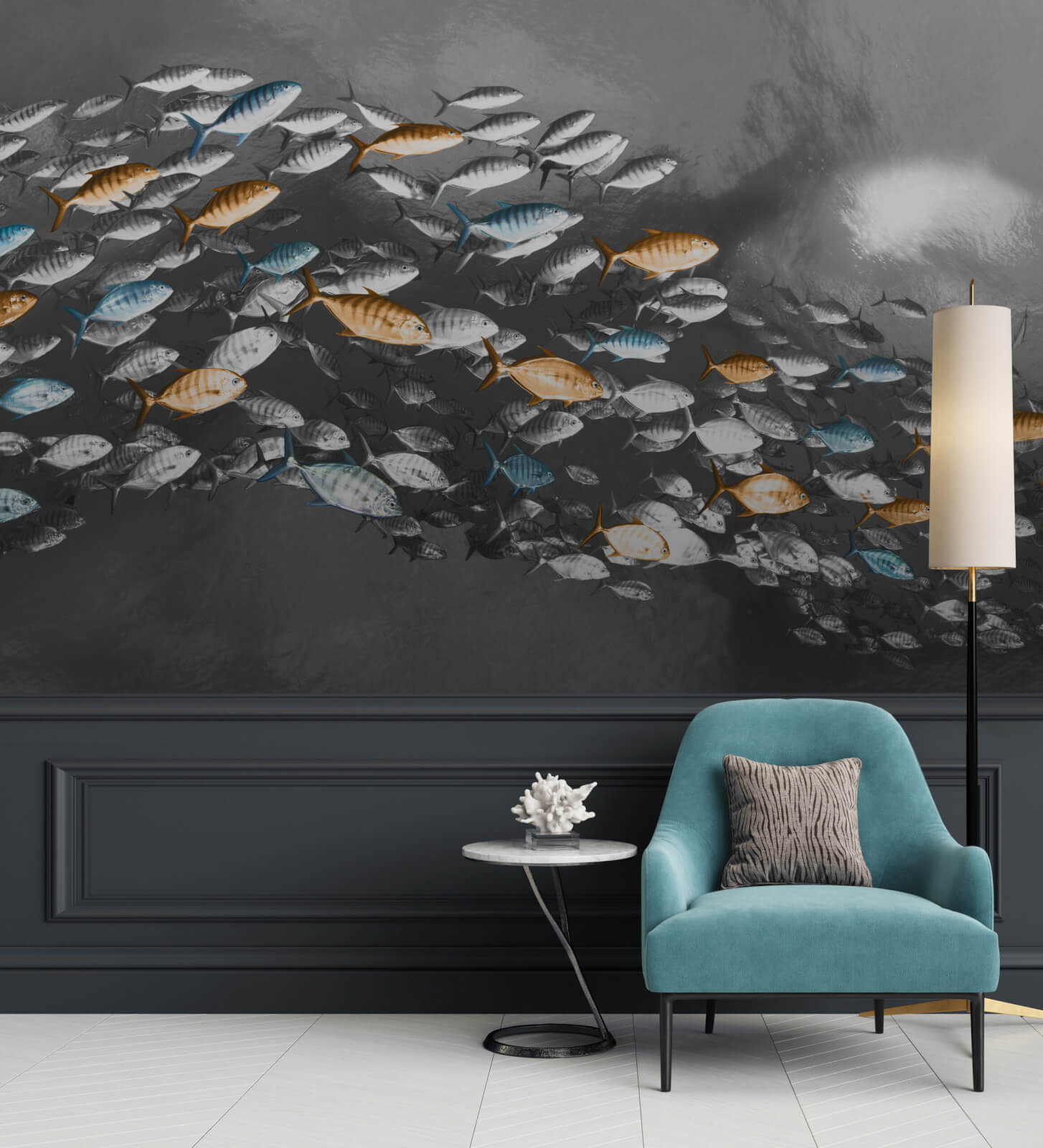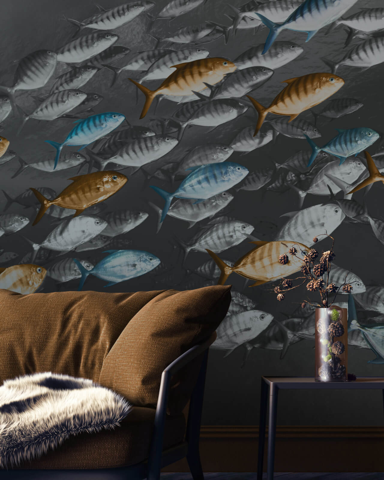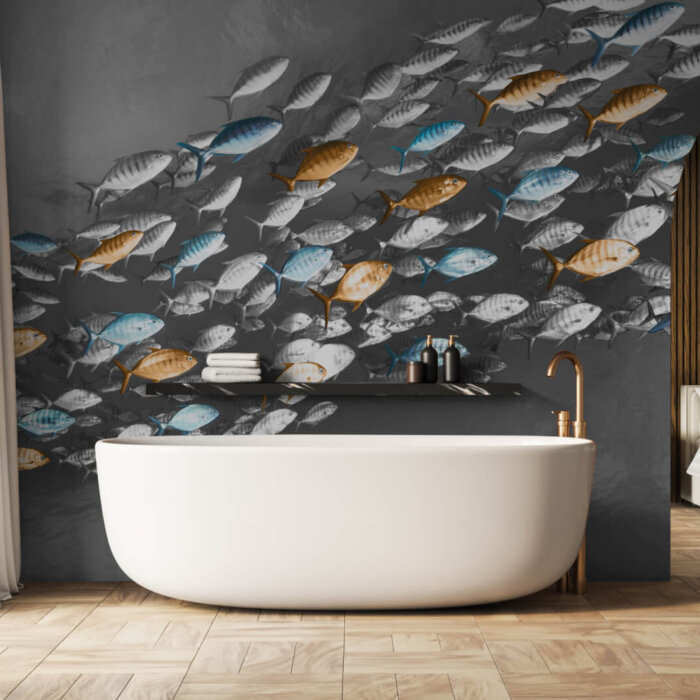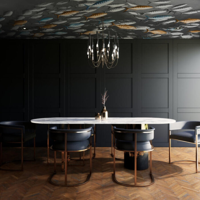 Meaning “of the sea,” Maris is a dynamic design that captures the synchronised energy of shoals of fish moving together as one. Textured scales and individual metallic blue and gold highlights catch the light, forming a dynamic and dramatic underwater seascape.